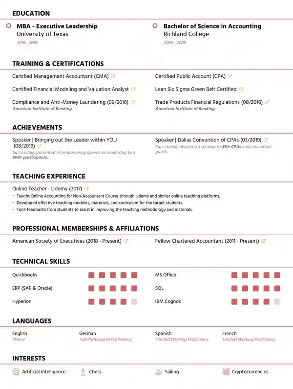 | Sections | Summary, Experience, Skills | Publications, Research, Grants | Family background, Physical details |